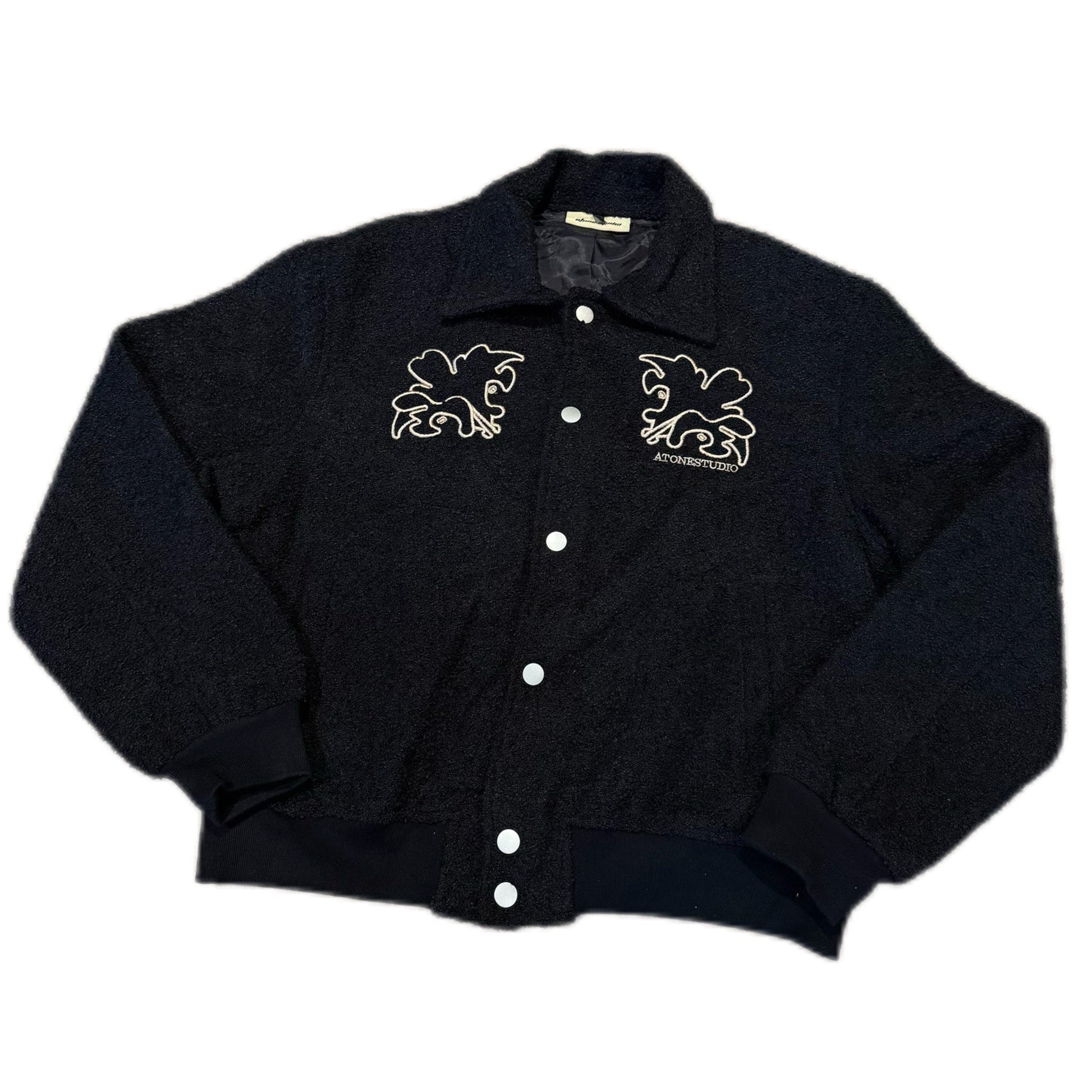 The Atone Studio Kamon Jacket blends Japanese heritage with a bold streetwear silhouette. Featuring detailed stitched embroidery and custom pearl embellishments, this piece stands out as both elegant and edgy.
