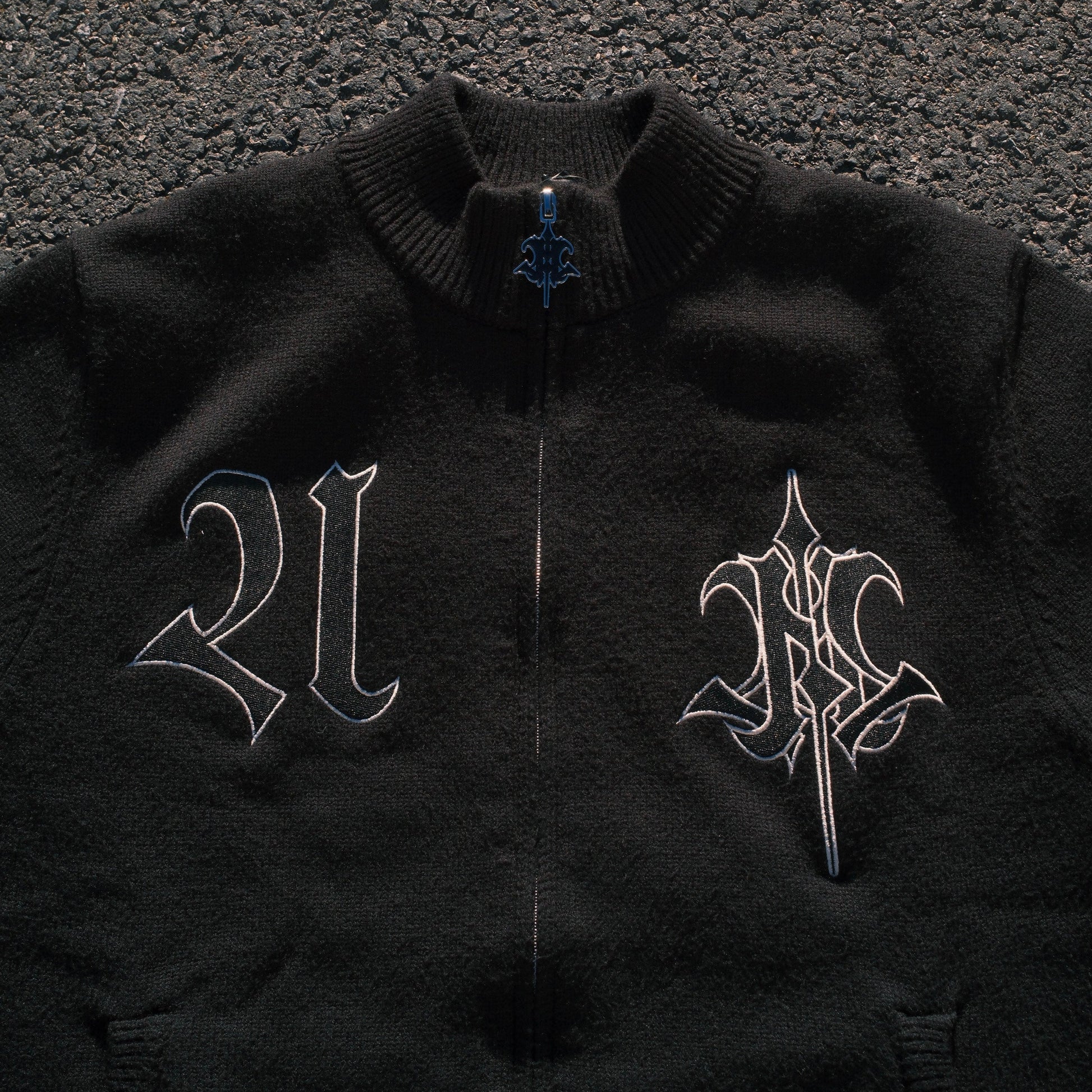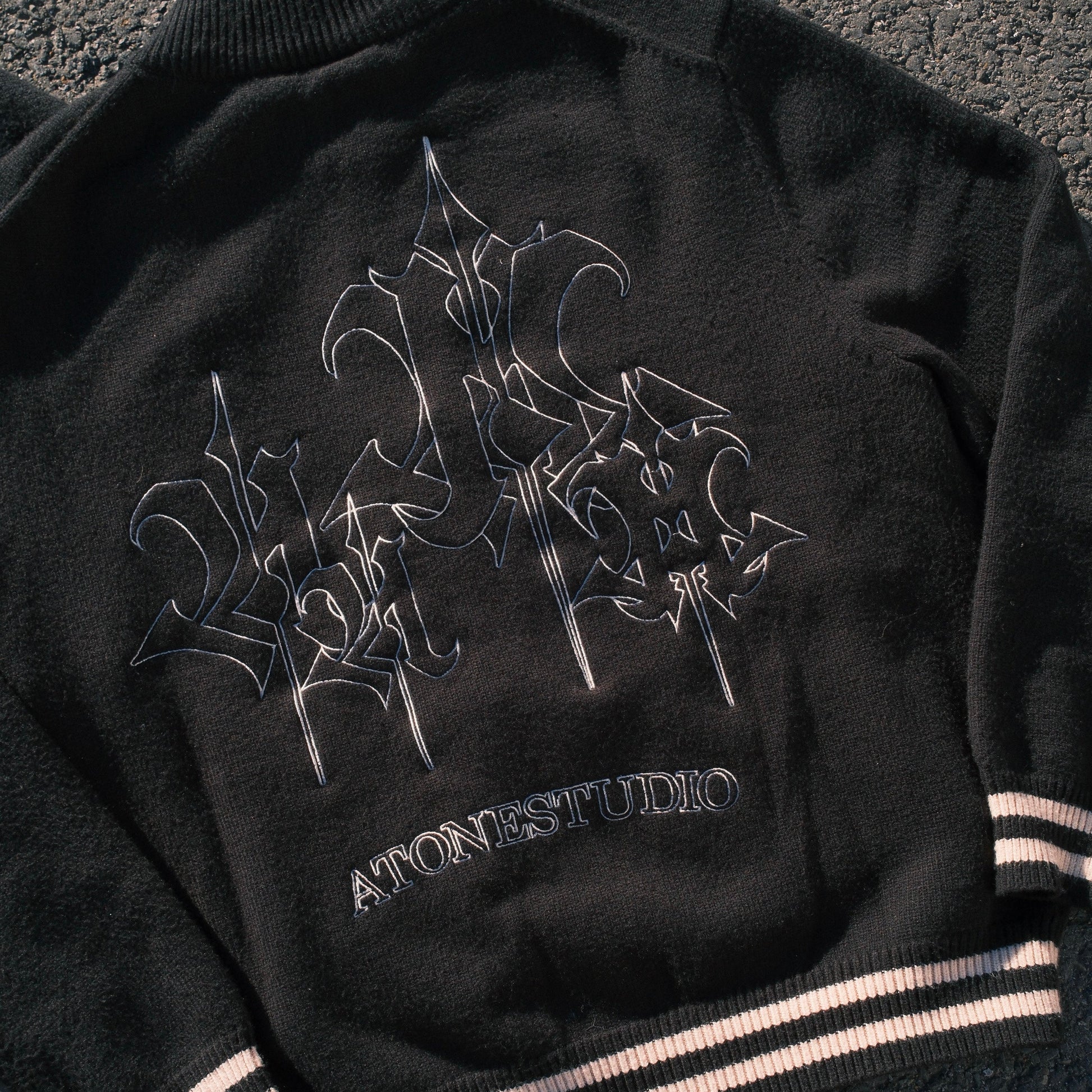 Crafted from soft yet structured knit fabric, this jacket features gothic-style embroidered logos on the front and an oversized signature graphic on the back. The striped ribbed cuffs and hem give it a classic varsity silhouette, while the tonal black-on-black design keeps things clean and elevated.